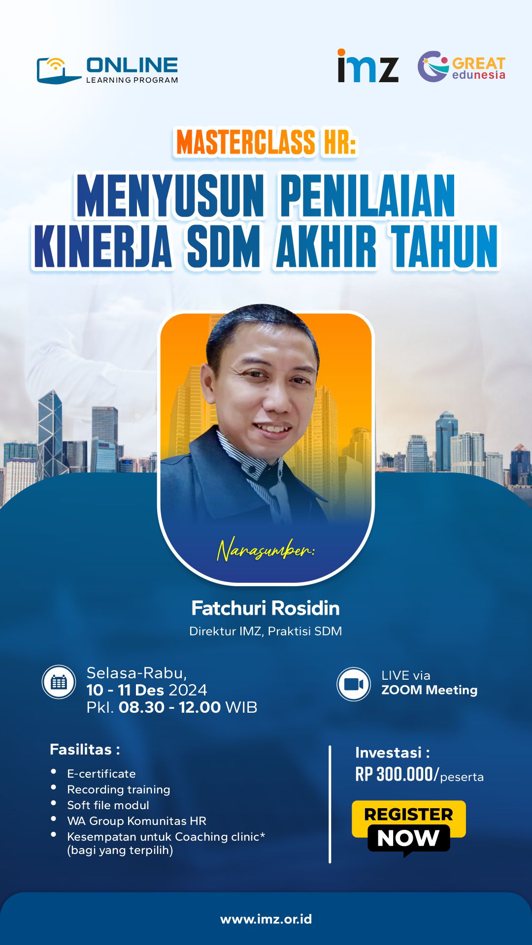 IMZ merupakan lembaga social enterprise yang fokus pada pengembangan kapasitas SDM dan pemberdayaan masyarakat. Berdiri sejak tahun 1999, kami menyediakan 4 layanan utama yakni pelatihan, pendampingan dan konsultasi, riset serta asesmen.